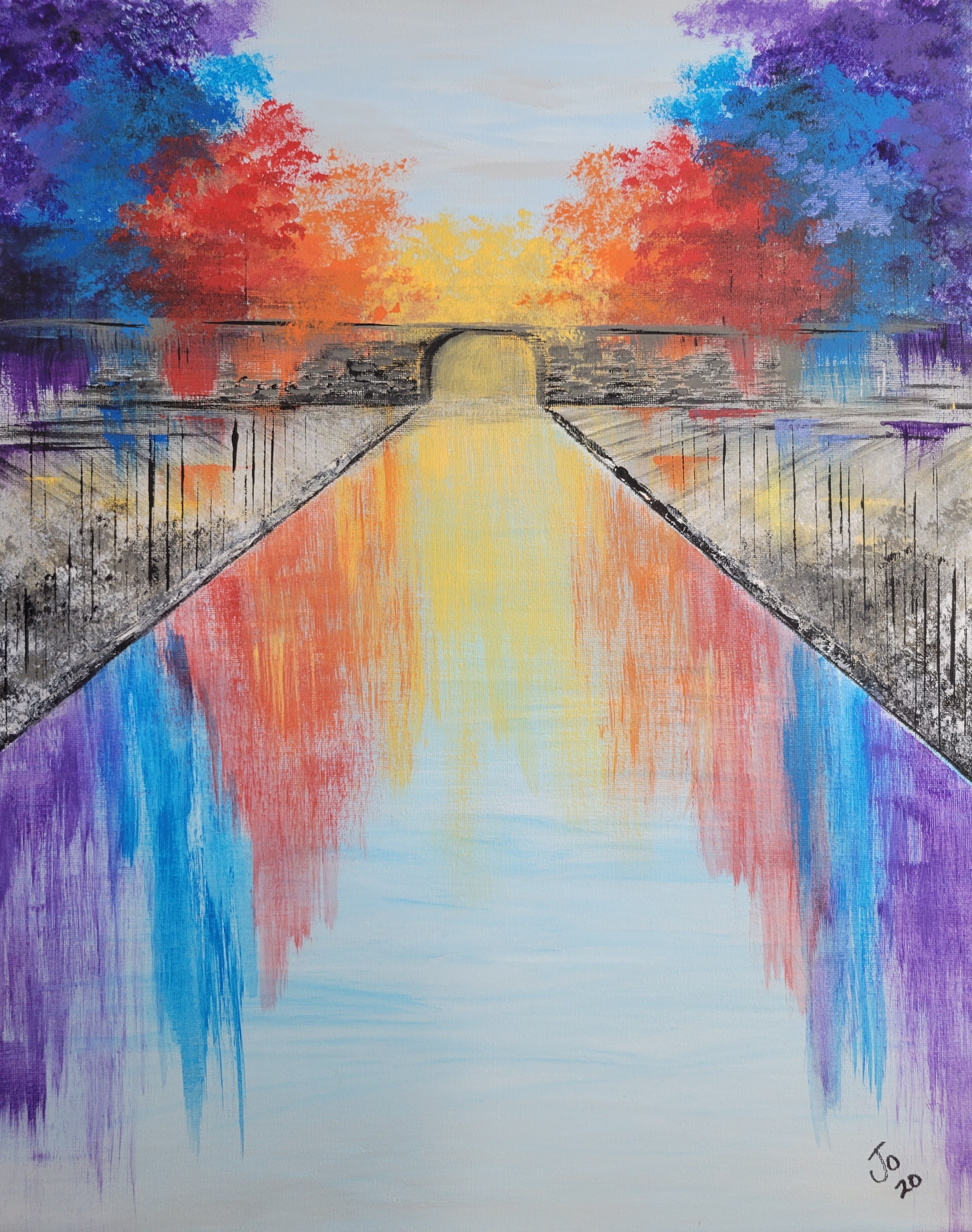 Interpreted from a photo taken in New Town. Before you is a wall with many ways to cross it, should you choose to cross it at all. What is beyond? The colors tell you that there is only one way to cross it. Boldly!