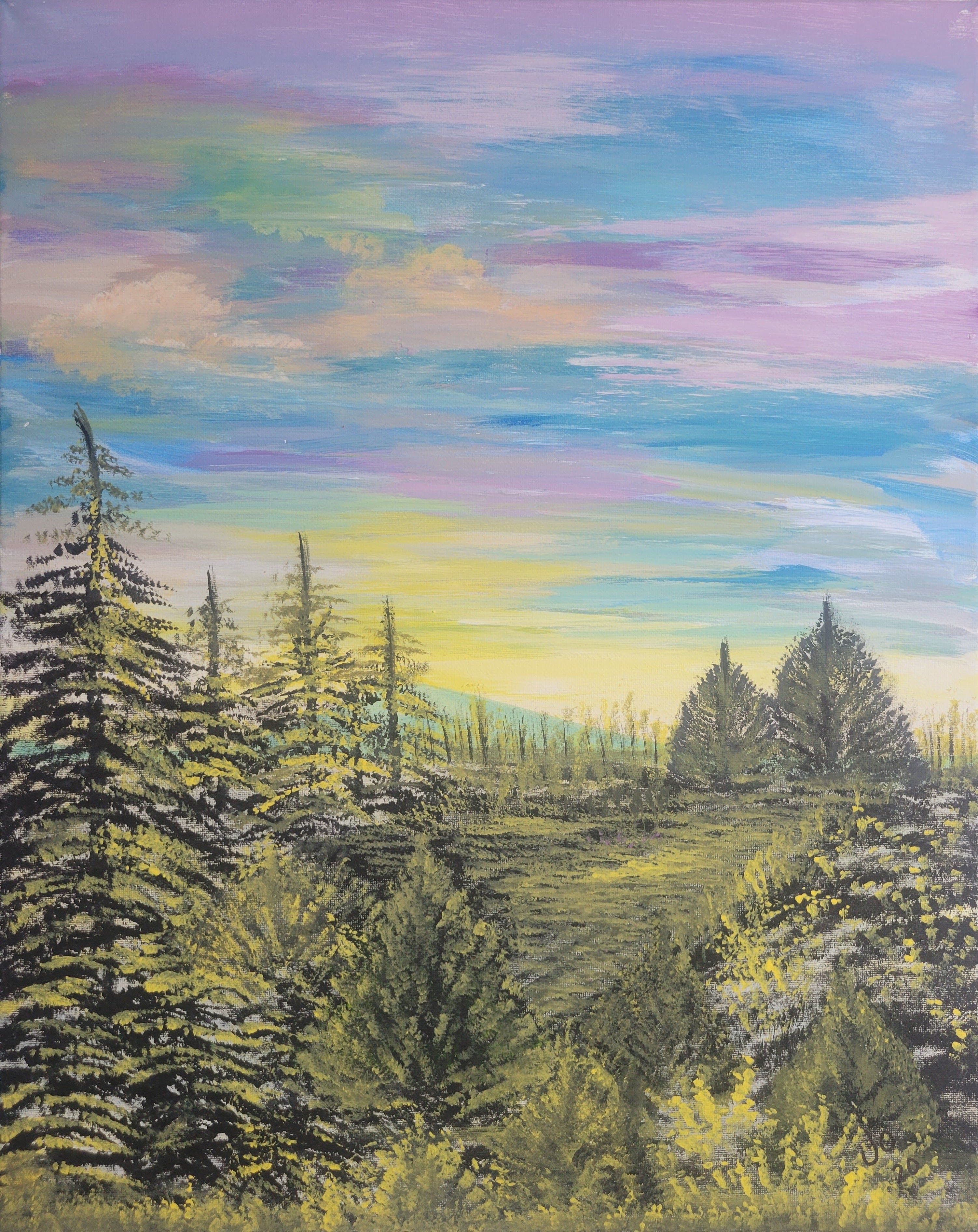 My son sent me a picture of the morning view outside of his home. I interpreted it into this painting.