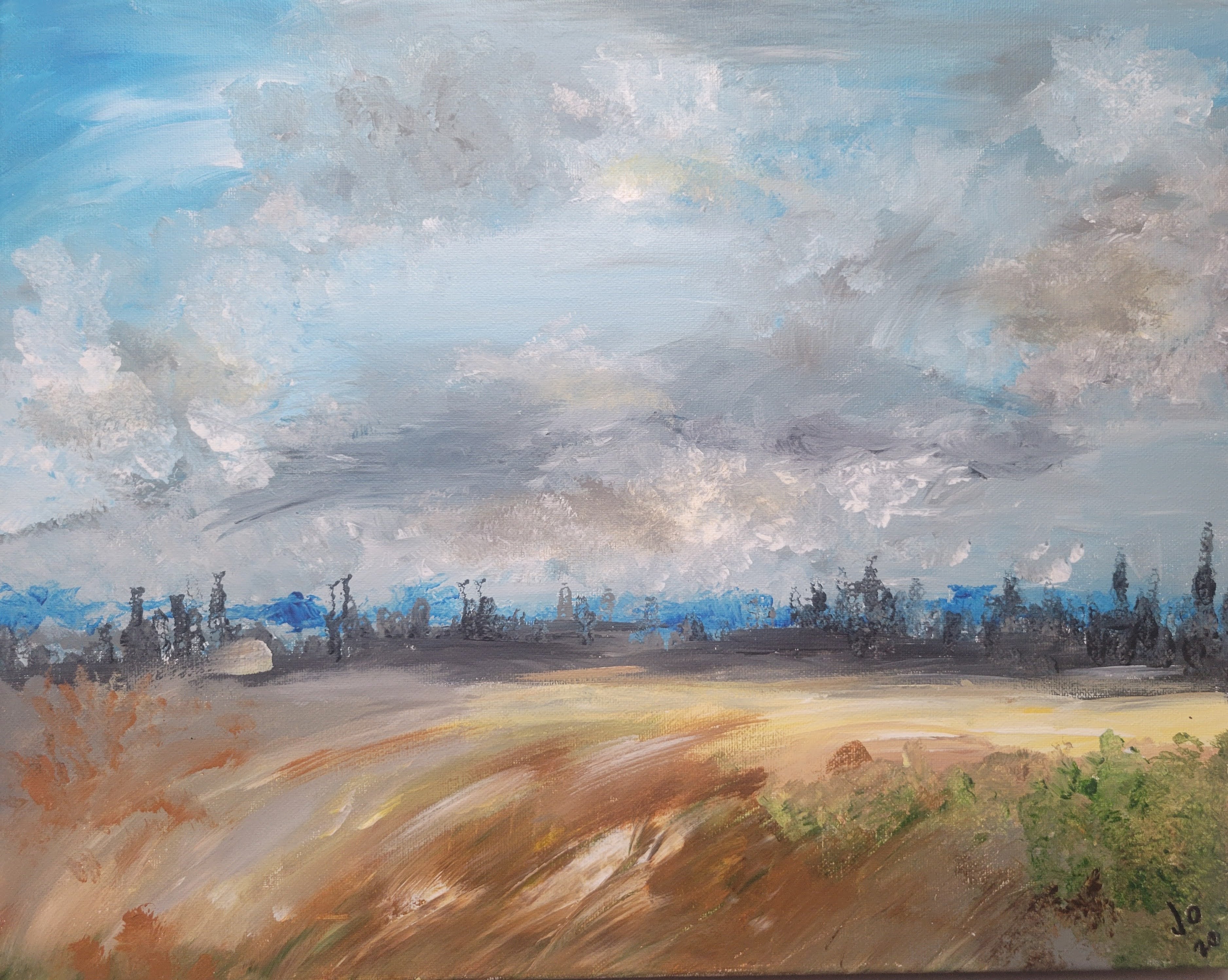 After a fun night of tossing a party, I woke up to this view from my porch. It was a cold winter day. The skies were in motion and hectic, but my vision and interpretation had it flowing all together through the paint…...Just let it fall.
